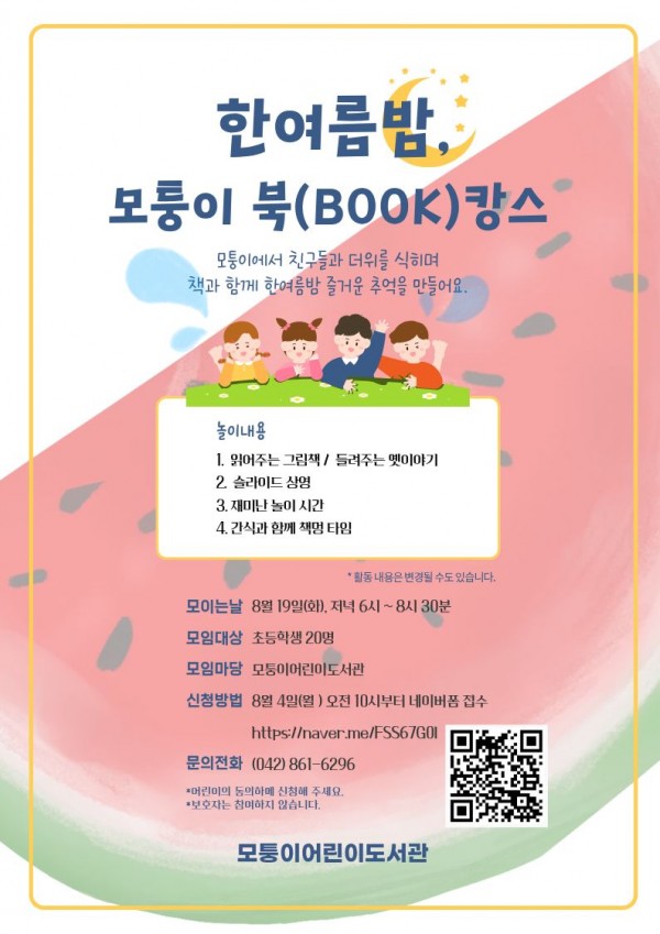 8월 19일, 여름방학 끝자락 어린이들과 저녁시간 도서관에 모여 책도 보고 놀이도 하며 북(BOOK)캉스를 보내려고 합니다.