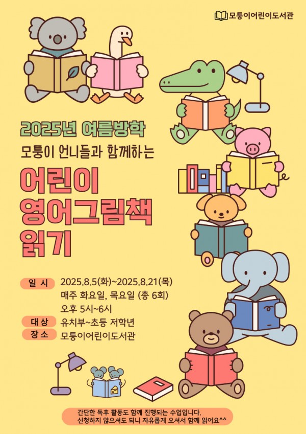 8월 매주 화,목 오후 5시에 중2 김가현, 정연재 학생이 영어책 읽어주기 수업을 진행합니다.