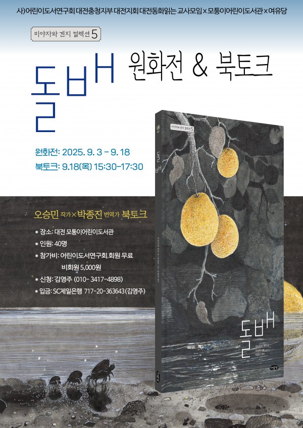 어린이도서연구회 대전지회 동화읽는교사모임에서 그림책 <돌배>의 그림을 그리신 오승민 작가님과 번역하신 박종진 번역가님의 북토크와 원화전시를 모퉁이어린이도서관에서 진행합니다.